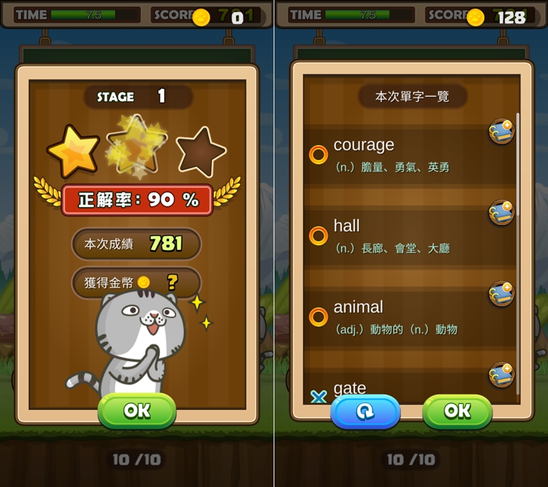 如果覺得一板一眼的 APP 壓力很大,可以從遊戲來學習,像這個就是以卡通化的方式由貓咪帶著你一起學,也是有英檢、多益、托福的字庫可選,由問答玩法開始吧。