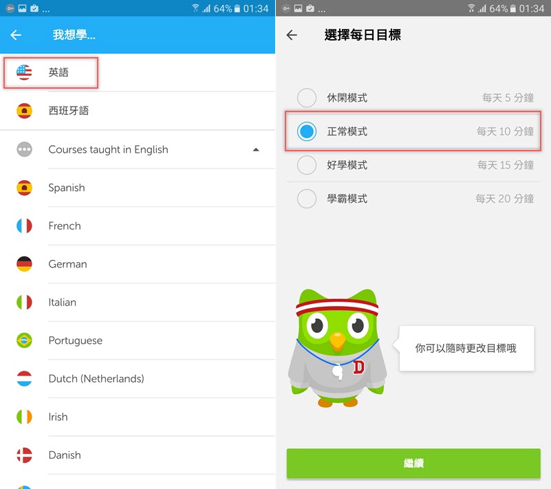 Duolingo 也有網站版本,除了英語還可以學西班牙語、法語、德語等等,開始前先定個每日目標,就選每日 10 分鐘的正常模式吧。