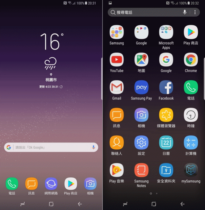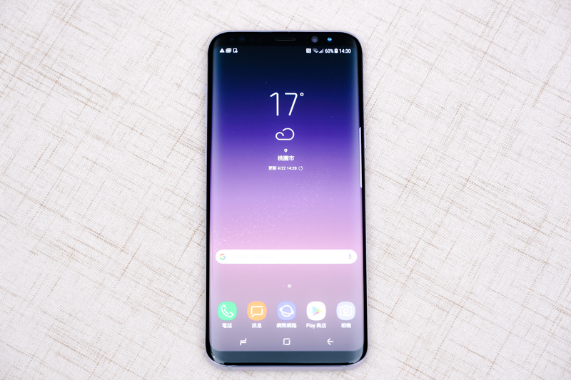 Galaxy S8/S8+ 這次依不同的顏色,預設的桌面色系也會有所不同,像阿湯這款是薰紫,桌面也是同色系,非常的好看,介面的部份非常清爽好看,如果要進到全部應用程式列表,在桌面上沒有 Apps 的按鈕,現在只要在主畫面往上滑就可以了,操作更加便利。