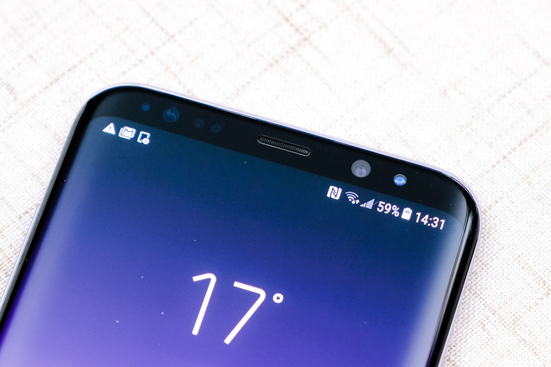 螢幕上方的範圍可以看的出來幾乎是極限的窄了,除了各種感應器之外,右邊分別是搭載 800 萬像素、F1.7 大光圈的前置鏡頭(支援自動對焦),以及這次也加入到 Galaxy S8/S8+ 的虹膜辨識。