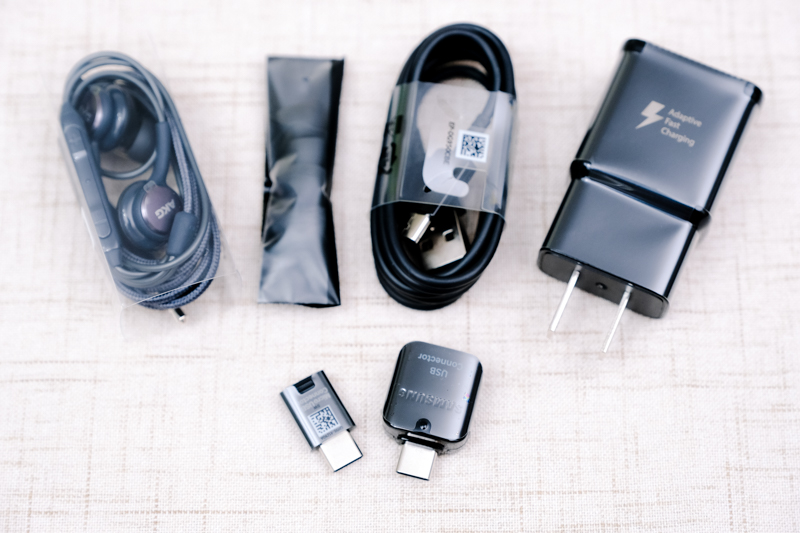 這次的配件包括 AKG 耳機、傳輸線以及變壓器,另外還附有二個轉接頭,分別是 microUSB 轉 USB Type-C 以及 USB Type-C OTG,方便你可以用在其他配件的轉接上。