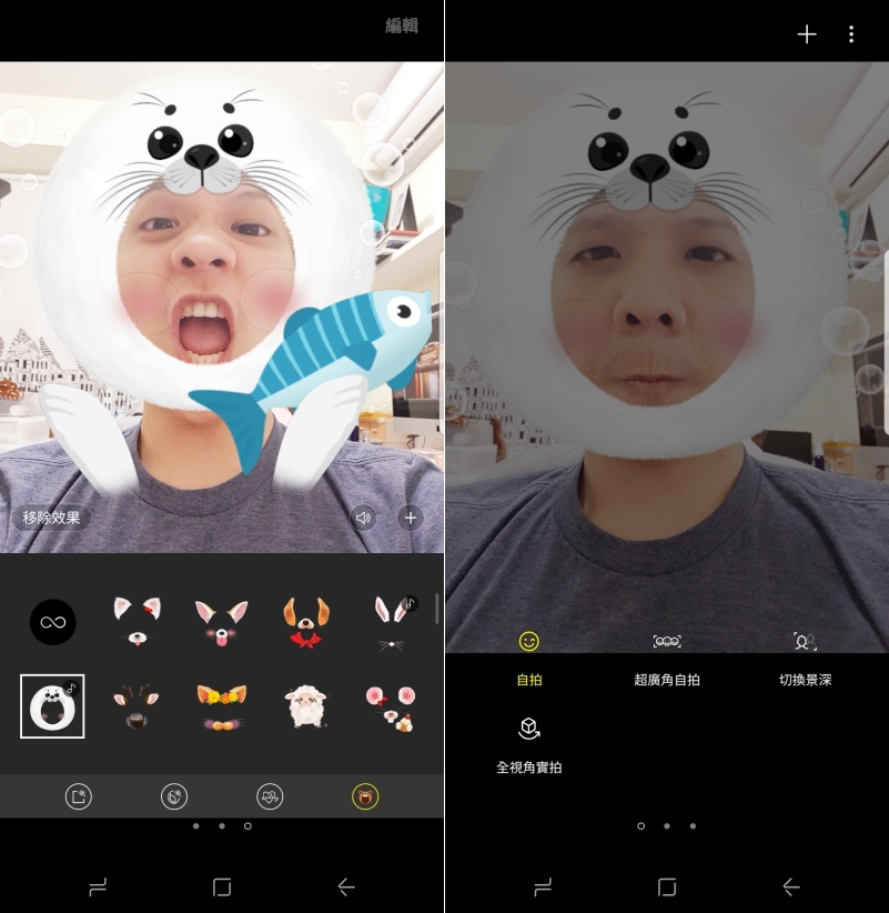 前鏡頭自拍下,除了支援超廣角自拍、景深模式以及全視角實拍之外,同樣支援動態特效貼圖,自己也可以對手機錄一些耍白痴的畫面,不過千萬不要在捷運上玩,可能會被當做是 ___。