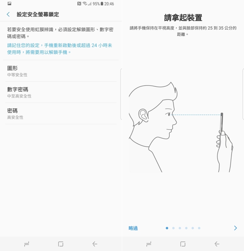 Galaxy S8/S8+ 是 Samsung 第二款搭載虹膜辨識的機種,不論設定及解鎖,都是和臉部保持 25~35 公分左右的距離。