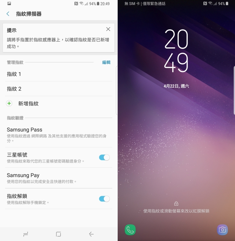 而指紋與虹膜解鎖可以並存,解鎖時可以自行選擇要用什麼方式。