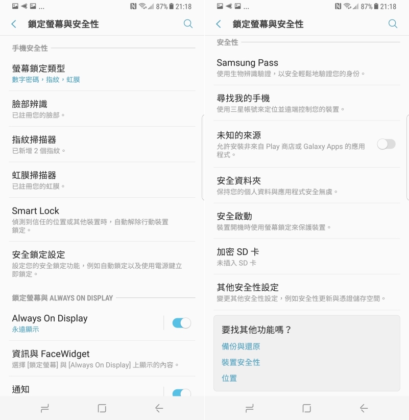 在安全性設定中,有很多附加功能,其中一個叫做「Samsung Pass」,這也是非常便利的功能,可以用在網站登入,簡單的說,網站只要用帳密登入過可以將他記錄到 Samsung Pass 裡,未來要再登入時,只需要透過指紋或虹膜辨識就可以直接登入,不需要再輸入帳密,更加的便利及安全。