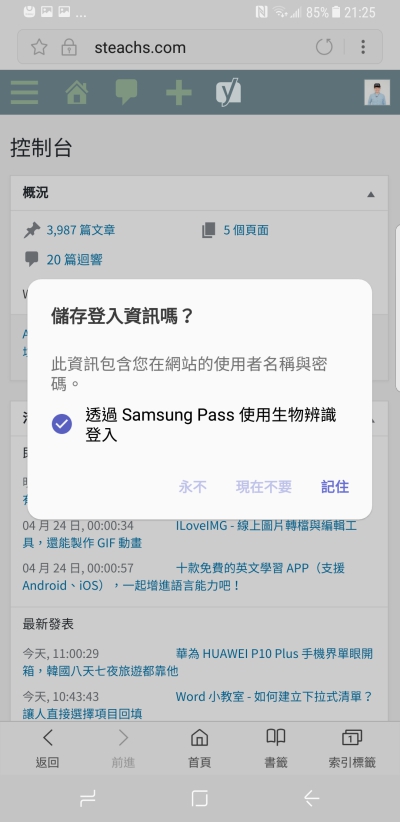 比如阿湯以自己的網站為例,登入後就會跳出提醒詢問是否要儲存登入資訊並透過 Samsung Pass 來登入。