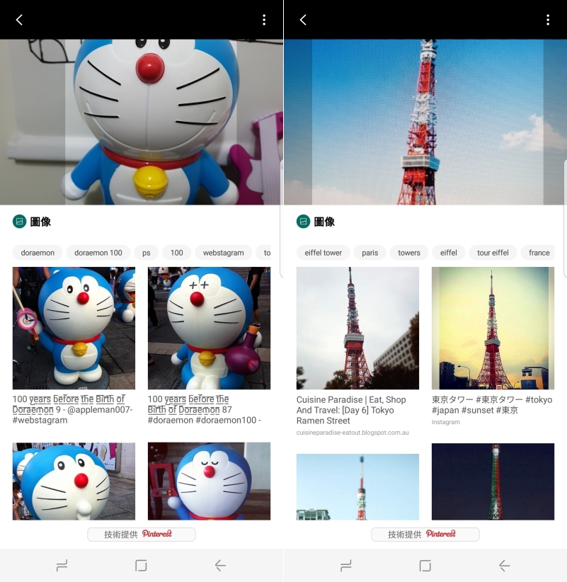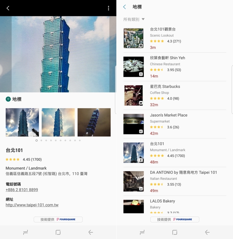 比如阿湯是拍攝台北 101 後搜尋地點,Bixby 會自動判斷地標後直接顯示該地標的相關資訊以及附近的地點有什麼。