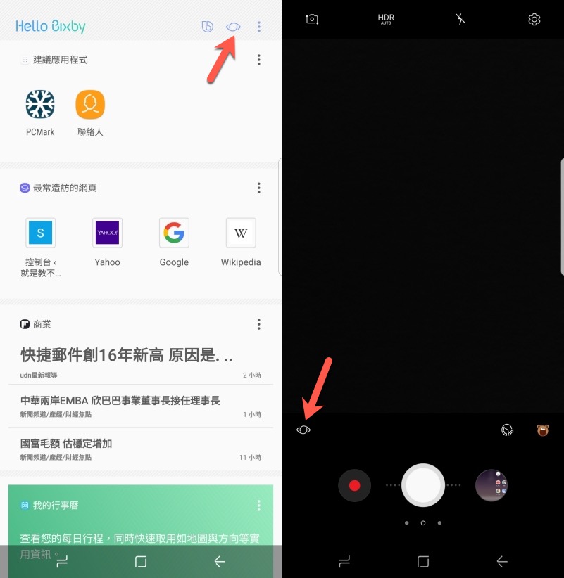 如果想要啟用 Bixby 的辨識功能,在 Bixby 主畫面右上角有快捷鍵,或者其實你直接開啟相機後,在左下角也有一個快捷鍵可以直接使用。
