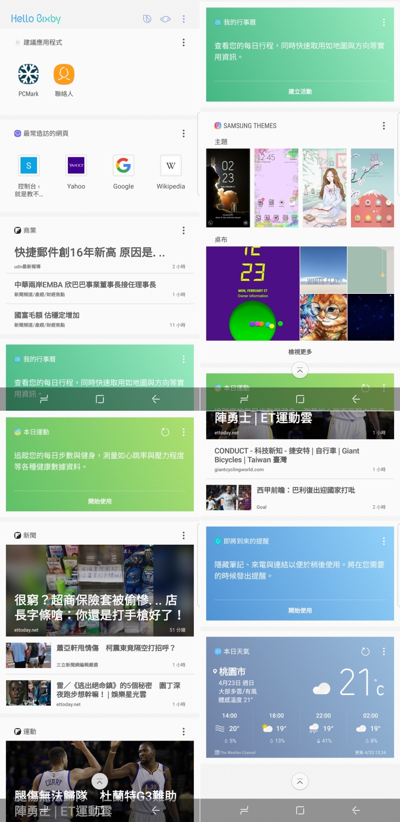 在平常的時候按下手機側邊的 Bixby 快捷鍵或是螢幕往最左邊滑動,都可以進到 Bixby 桌面,在這裡會顯示你的常用內容,或者像是行事曆、天氣新聞等,會依照你的使用習慣顯示對你有用的內容。