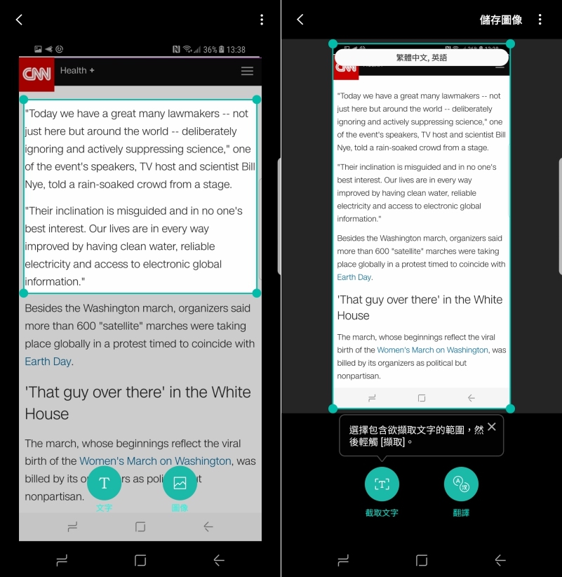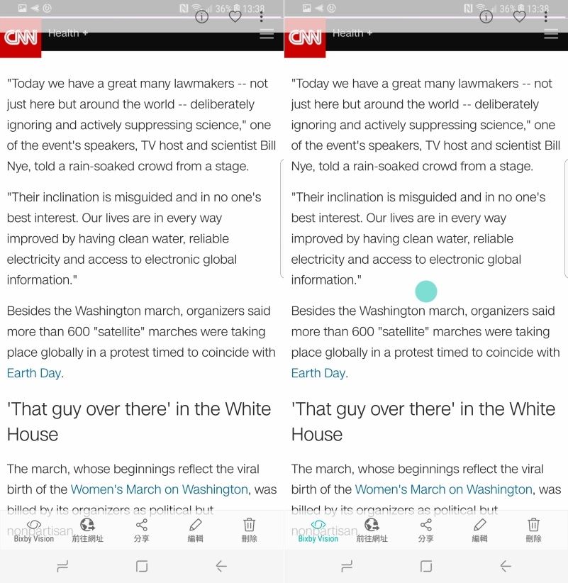再來示範一下最常會用到的文字辨識功能,以阿湯自己最常用來練習讀英文的 CNN 新聞為範例,比如在手機上看一看之後如果有看不懂的,想擷取下來的內容,直接在畫面上截圖後,在圖片左下角會看到一個「Bixby Vision」,點擊後中間會看到小綠點,再點他一下就可以進入辨識畫面。