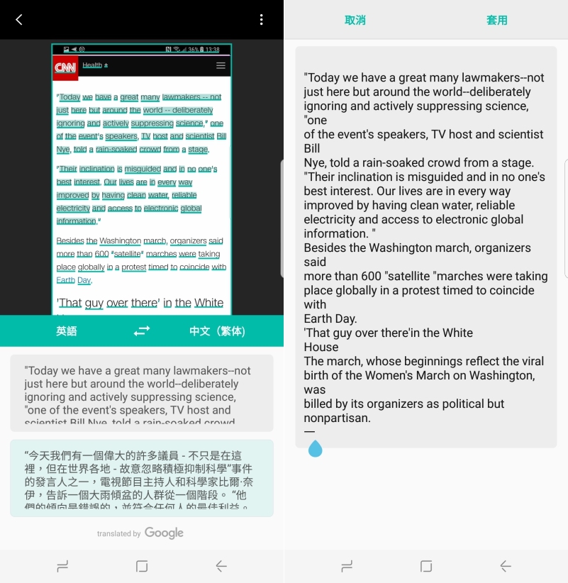 翻譯的部份主要是搭配 Google 翻譯,文字截取也相當精準,不僅是英文,中文同樣辨識沒問題哦。