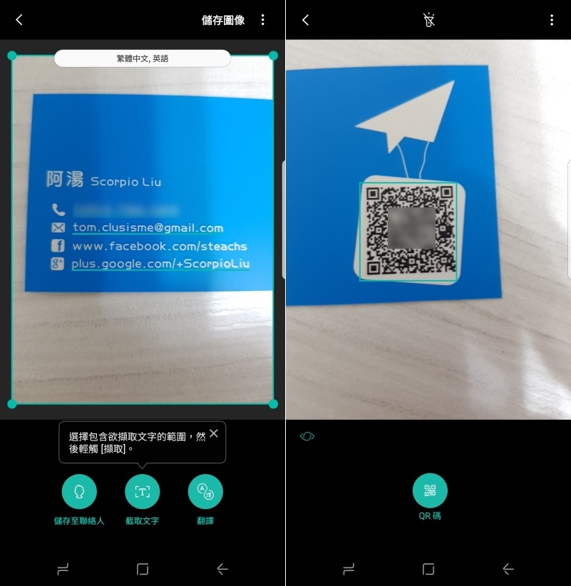 使用 Bixby 掃描名片也會自動將資訊辨識,讓你方便直接儲存至聯絡人。遇上 QR Code 也能直接掃描,不需再另外使用其他 APP。