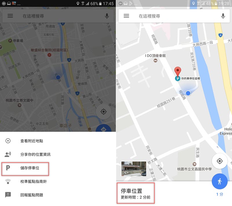 建議大家一定要去更新,理論上應該 Android 和 iOS 都已經開放了,進到 Google 地圖後點定位的那個藍點,下面就會多出一個「儲存停車位」,點它就會在地圖上標好位置,並以「更新時間」代表你停了多久。
