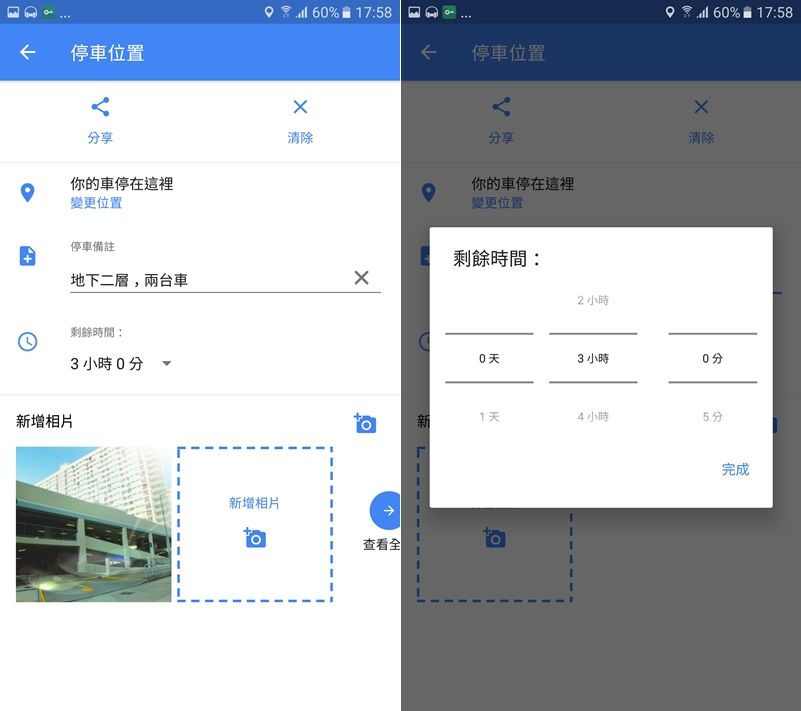 點進來繼續編輯,可以備註停車場名稱、車位號碼等詳細資訊,如果不是停車場也可以寫靠近哪個東西,還可以加入周遭相片,重要的是可以計時,一般停車場都會標示停多久免費、或是使用什麼卡可以停多久,現在只要在這裡設定,就會幫你倒數計時,有的停車場超過幾分鐘就會算一小時的錢,有這功能真的蠻方便。