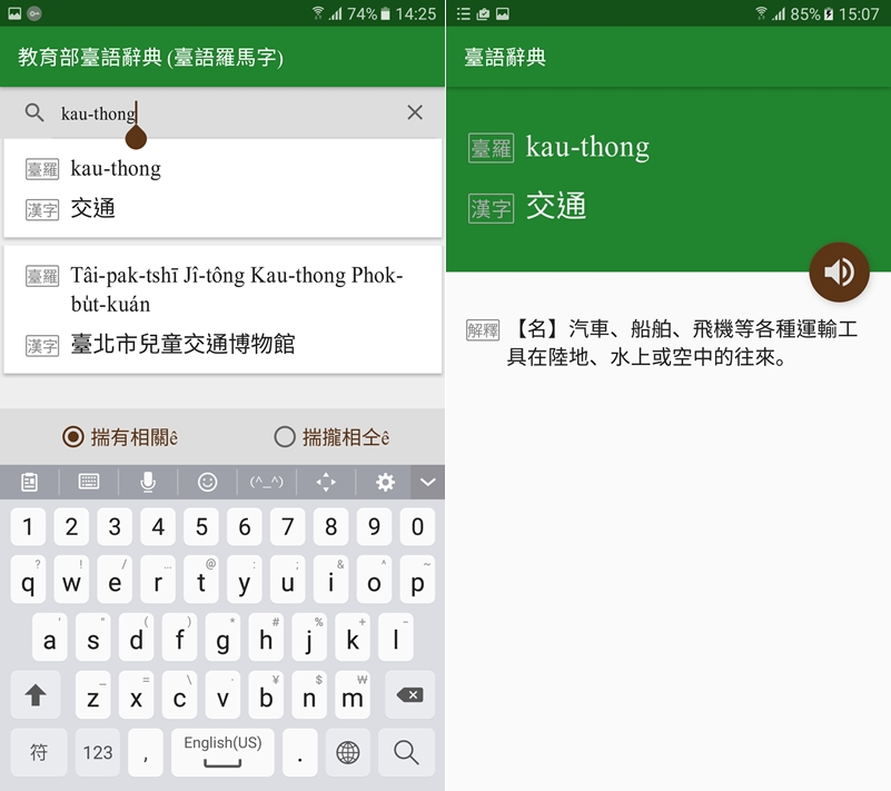 阿湯依序示範給大家看,先是臺語羅馬字,輸入「交通」的拼音且沒加聲調,預設沒改,所以會連相關字詞都出來,點進去會一併顯示臺羅跟漢字,還有白話的解釋,按喇叭符號就可以聽發音,阿湯是覺得蠻標準的。