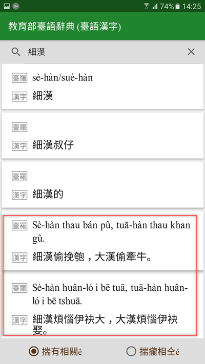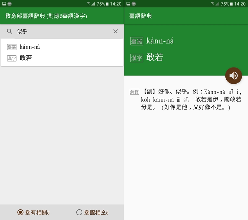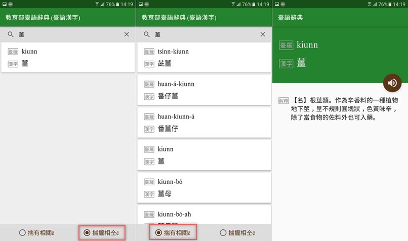 使用臺語漢字,輸入「薑」下面改成完全符合就會只顯示薑,不然就會把跟薑有關的都搜尋出來,一樣有發音,網路一定要連線才能聽聲音。