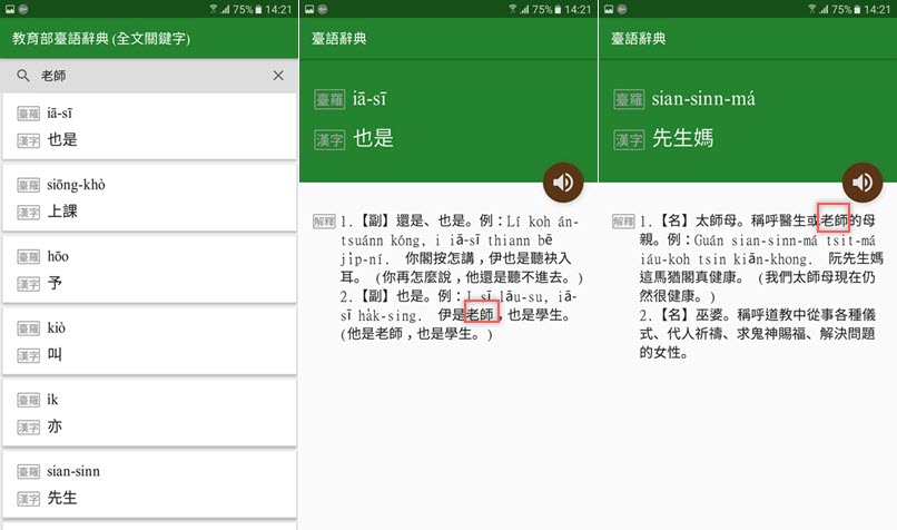 如果用全文關鍵字就更細了,通常是本身就有接觸教育部版的辭典才會這樣查,例如查「老師」,就會連解釋裡有「老師」兩個字的都顯示。
