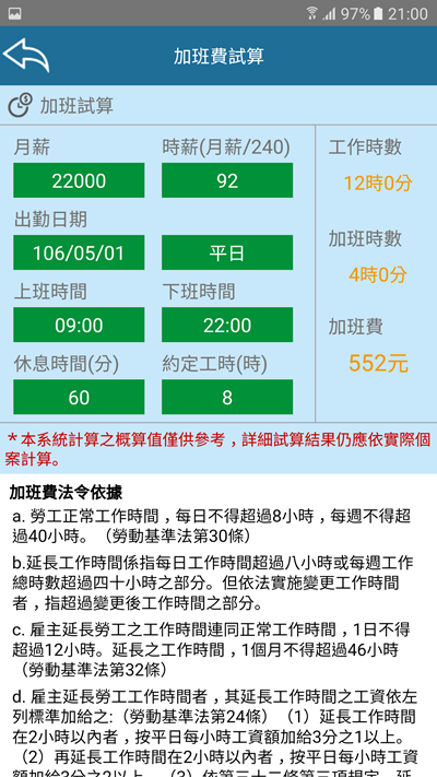 加班費試算,填入月薪後會換算成時薪,再選你是哪一天加班,上班時間與下班時間(加班完的時間),休息多久與約定工時,注意一下單位不要填錯,右邊就會幫你算好,下面也會列出計算的法令依據。