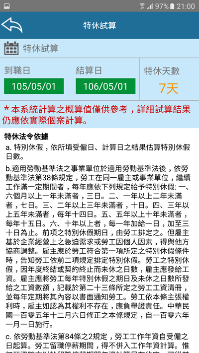 特休幾天也是很重要的,雖然很好算,但還是可以用 APP 再確認,像一年的話就是剛好 7 天。