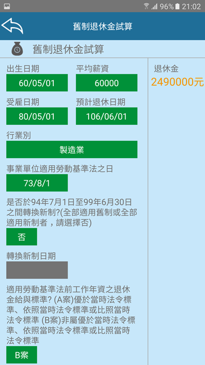 退休金計算目前只有舊制的,要輸入的是出生日期、平均薪資、受雇日期和預計哪一天退休,假設是民國 60 年出生在製造業工作 20 幾年,月薪 6 萬的人,退休金算出來就有 249 萬。
