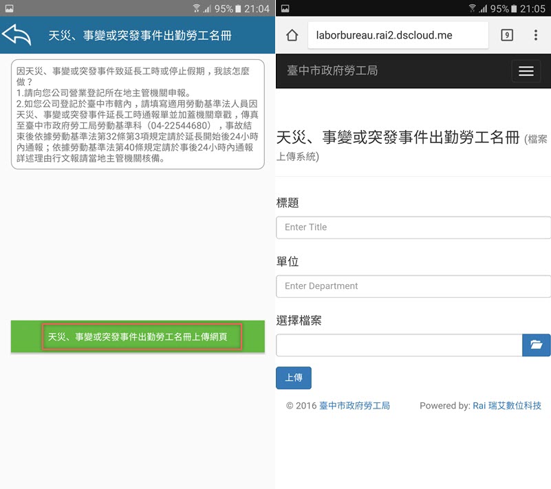 這裡是用來上傳名冊的,像是颱風天被叫去加班其實是要申報的,如果你剛好在台中工作就可以從這裡上傳資料到台中市政府勞工局辦理。
