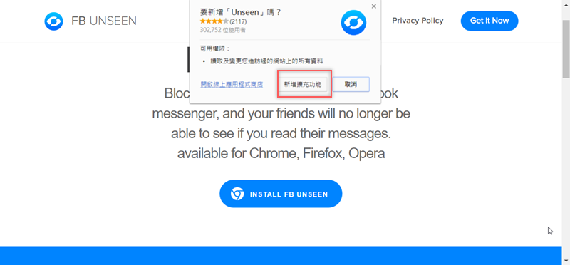 阿湯是從官網進入的,你也可以從 Chrome 擴充套件頁面進去,點「INSTALL FB UNSEEN」就會開始安裝程序,這款外掛支援了 Chrome、Opera、FireFox 三種瀏覽器,按下去後會自動判定。