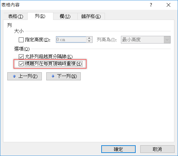 到了上一篇文章用過設定的地方,這次要將下面「標題列在每頁頂端時重複」打勾,點確定。