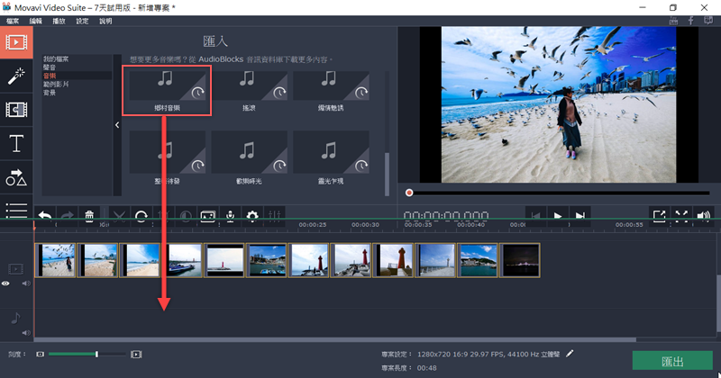 這類軟體的編輯方式都差不多,大部分都是從顯示的時間軸來編輯,例如加個背景音樂,就直接將要加的音樂檔拖進去,再調整大小即可。
