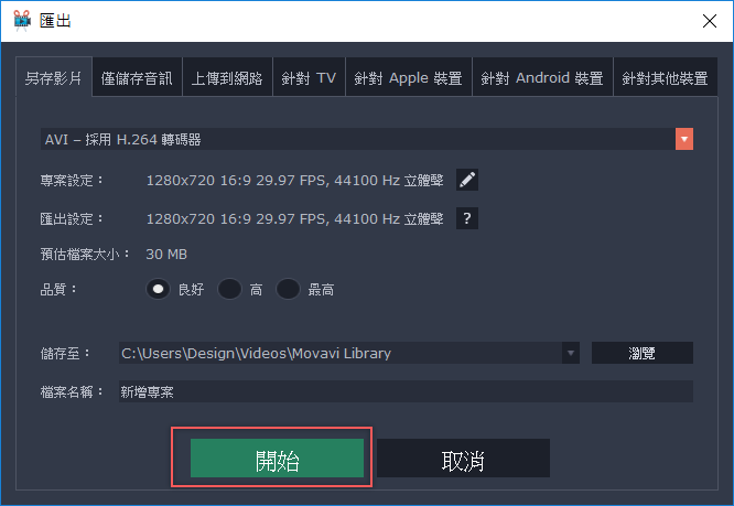 選擇要轉換的檔案格式與品質,也可以只存音訊、上傳到網路,或針對 TV、Android 裝置、Apple 裝置來存取,決定好就按開始吧。