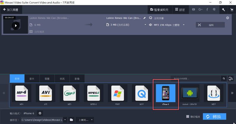 把要轉的檔案匯入,再從下面選擇輸出格式,例如 iPhone 6,再點「轉換」即可。