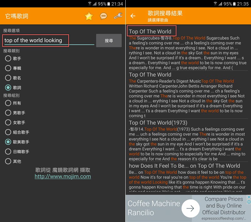再輸入一首知名英文老歌的歌詞「top of the world looking」,其實也幾乎等於歌名,所以一搜就到。