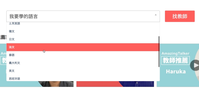 然後簡單的講一下網站介面,在首頁就可以直接選擇你想要學習的語言來篩選老師,目前一共有 13 種語言可以選擇,常見的日、韓、英、法等都有。