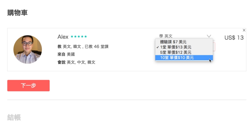 而購買正式課程時,可以選擇一次購買 1 堂、5 堂或 10 堂,原則上愈多堂課愈便宜,這些價格都是由老師自己定制,所以每位老師的價格都會不同,你也可以依自己的預算篩選適合自己的老師。