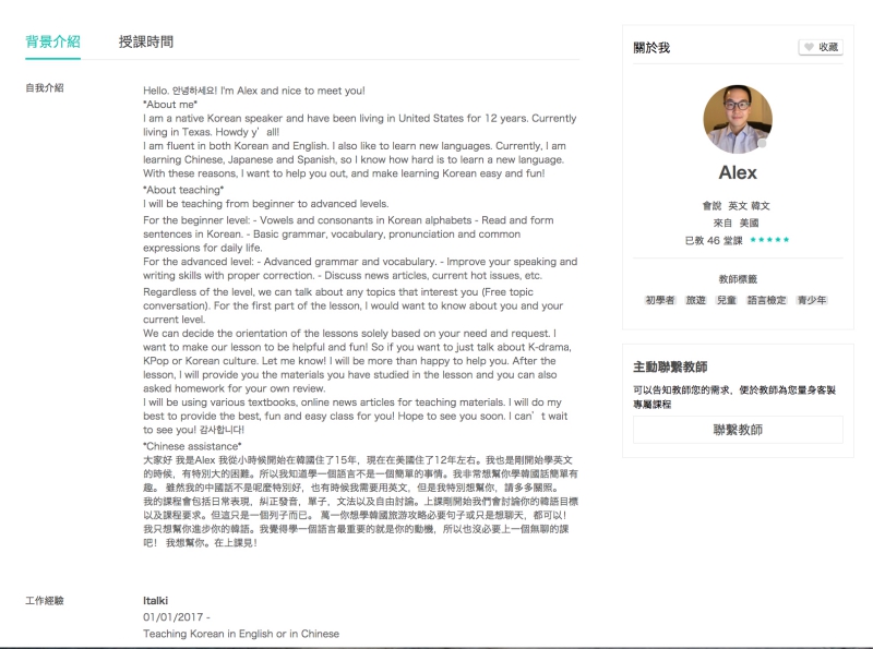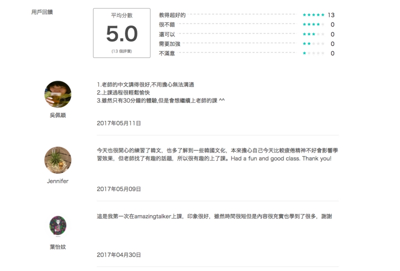 這邊也要跟大家講一下,AmazingTalker 裡的老師在加入時,都會經由官方審核,一定都會有教學經驗才能加入,因此不用擔心會不會有那種進來亂入的老師,原則上是不會有問題的。