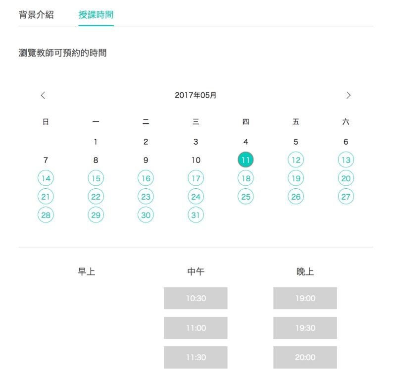 在購買課程前也可以先查看老師可以授課的時間,這樣你才知道這位老師能夠授課的時間是否有符合你的時間。