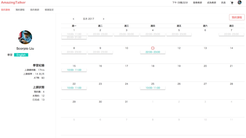 在後台的介面也相當好用,我的課表中,灰色代表已經上過的課程,阿湯自己最高一天上二堂,時間允許的話,每天都會上課,或者至少 2~3 天上一堂,而且上課我都是採全英文的方式,強迫自己講英文,強化練習,目前覺得英文回神了不少啊。