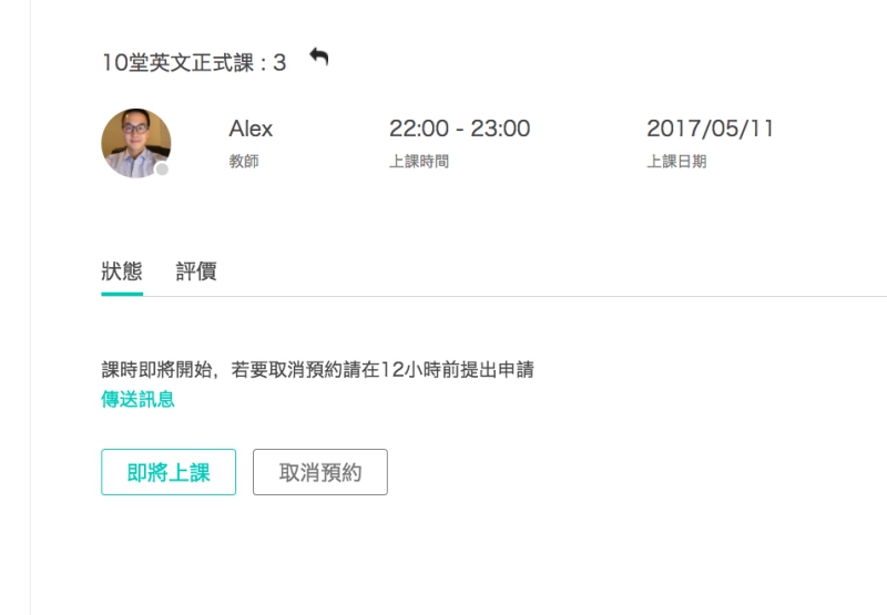 點擊要上的課程時間,當上課前十分鐘時,「即將上課」的字樣就會變成「進入教室」,如果要取消預約,只要在 12 小時前取消就可以了,課程堂數就會歸還給你,就可以再重新預約。