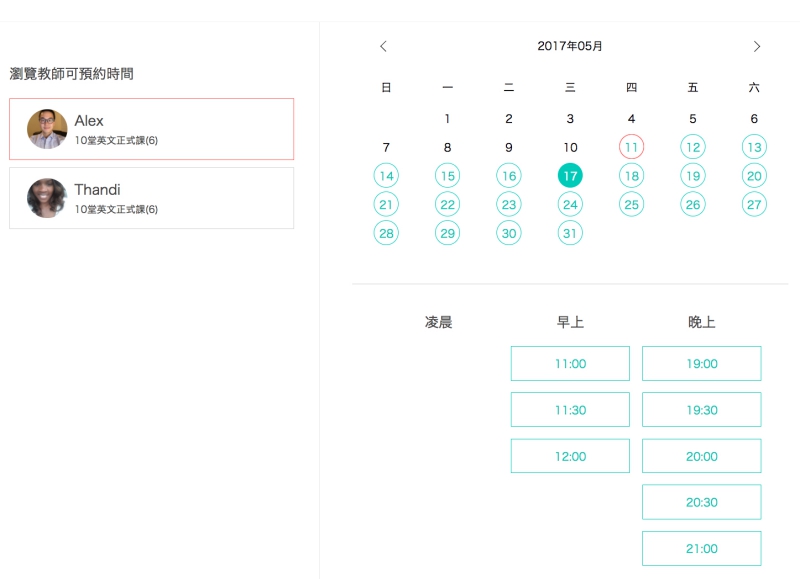在後台預約課程也只要點選老師然後選擇想要預約的時段就搞定。