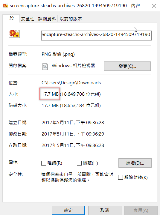 下載的圖片是 PNG 檔,打開來可以看見網頁從頭到尾都有抓到,擷取得乾淨又清晰,像這張就有 17.7MB。