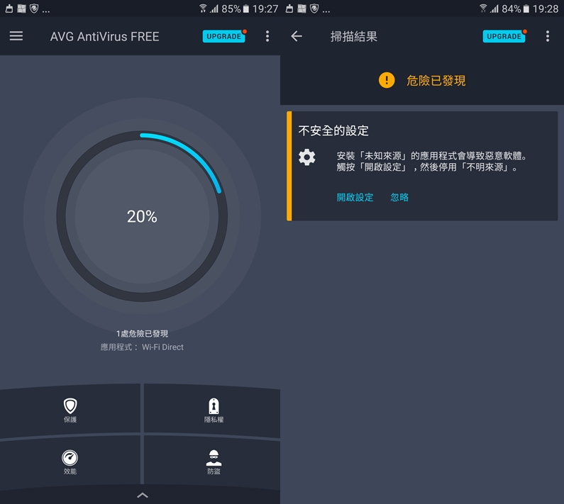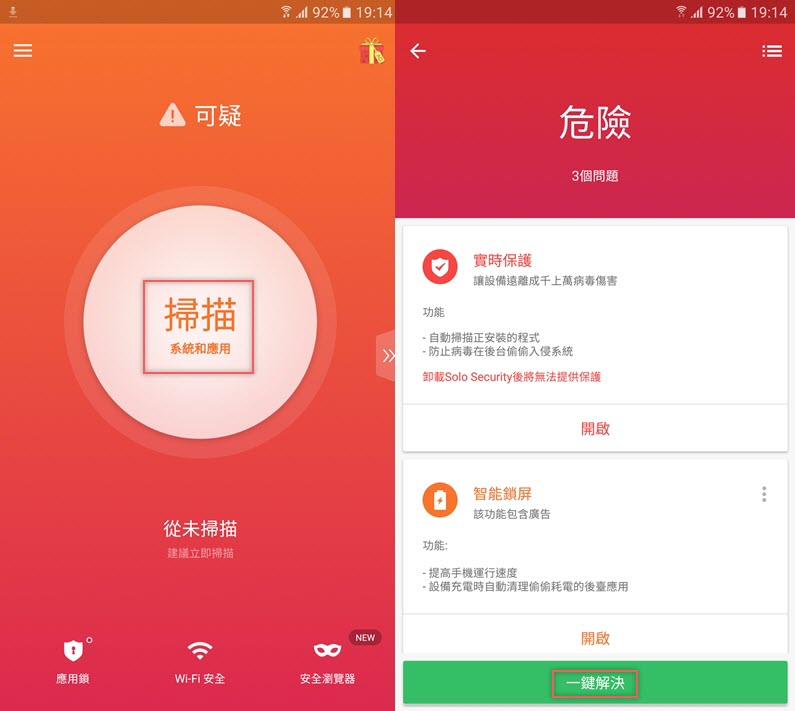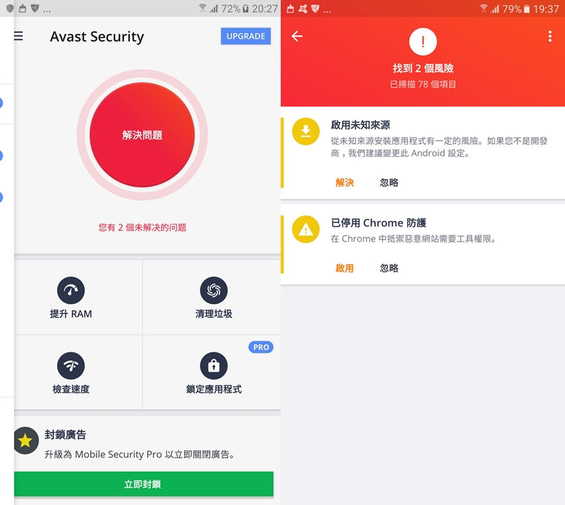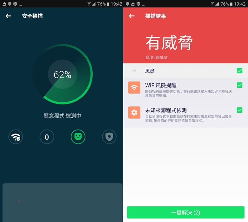 這也是一款常見的電腦防毒軟體,掃描後發現的風險有「啟用未知來源」和「停用 Chrome 防護」,可選擇要不要解決。