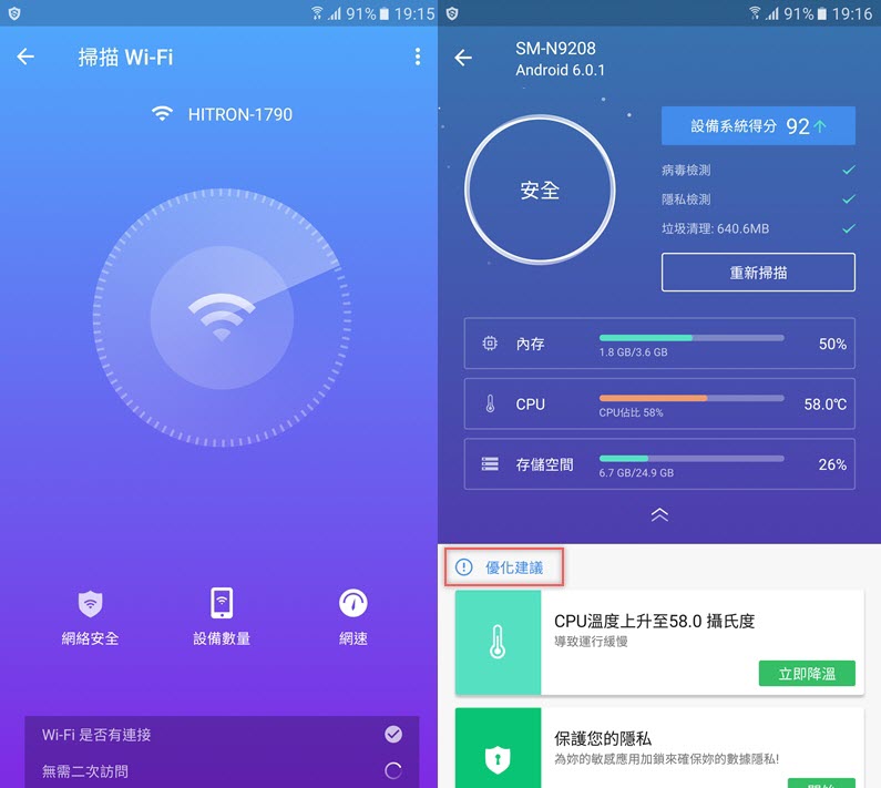 也能針對 Wi-Fi 掃描,掃描後一樣會出現檢查的結果,螢幕往左滑就會看到目前手機的狀態,下面有相關的優化建議可選擇,像是降溫或隱私保護,點選即可運作。