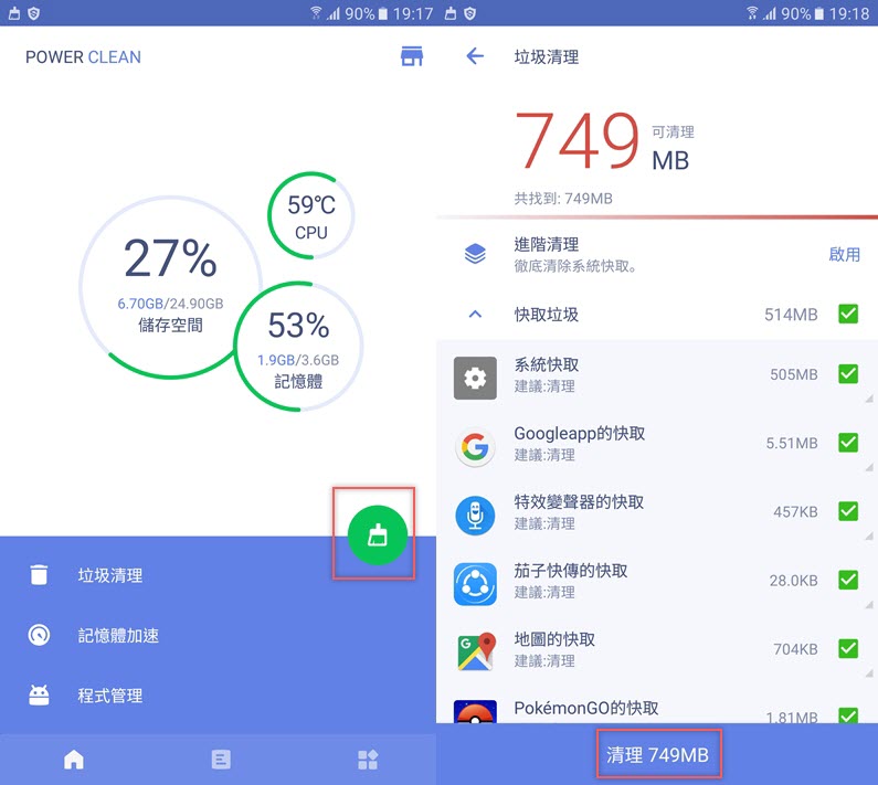 開啟後自動檢查目前手機狀態,包括儲存空間、記憶體、CPU 溫度,點右下方刷子圖示掃一下有哪些垃圾,大部分是一些快取佔空間,再點最下面來清理。
