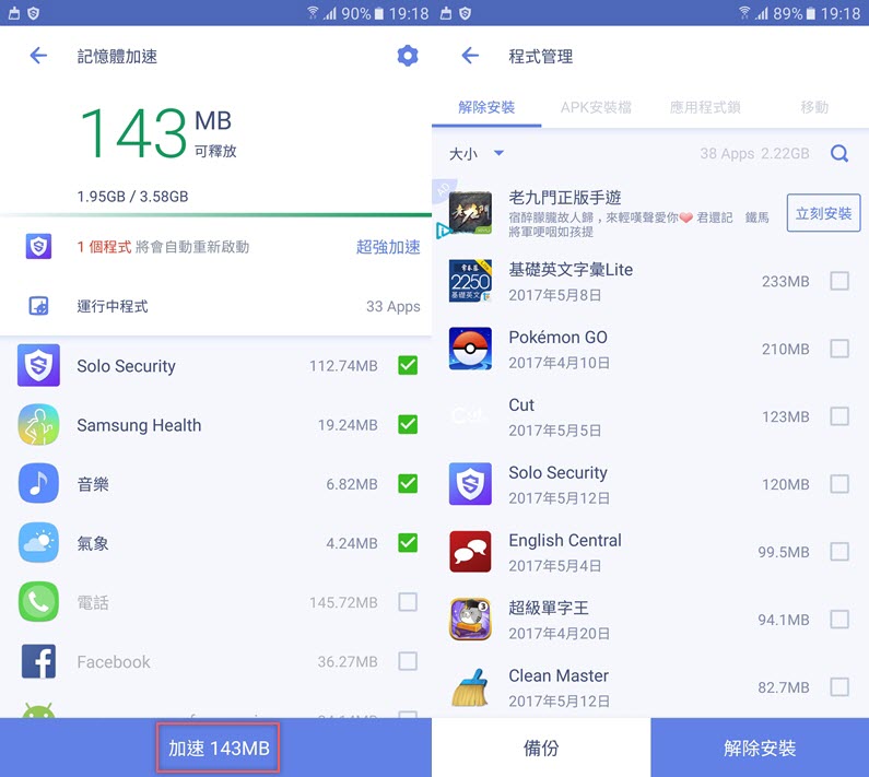 再到記憶體加速看看還能釋放多少空間,也可以從這裡進行程式管理,把不需要的程式解除安裝。