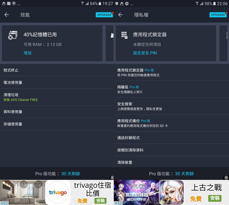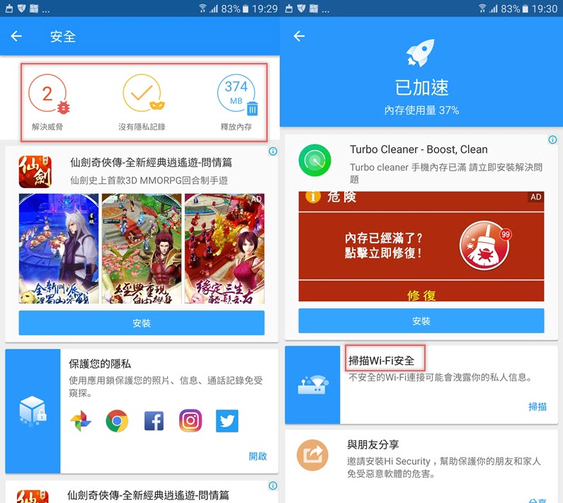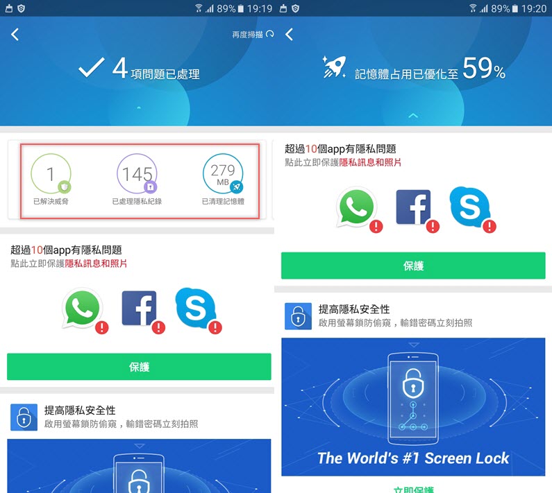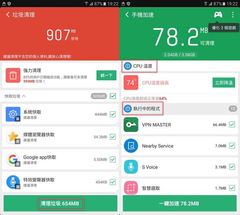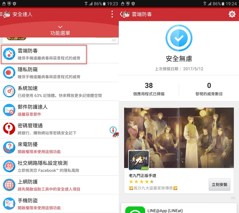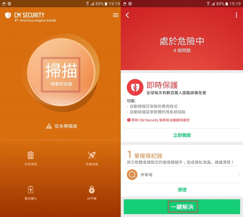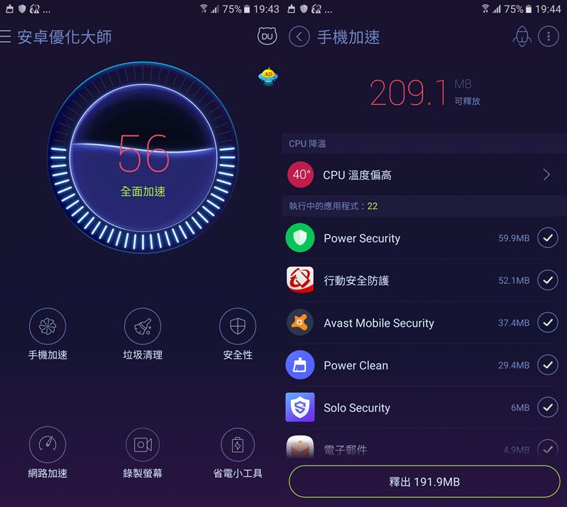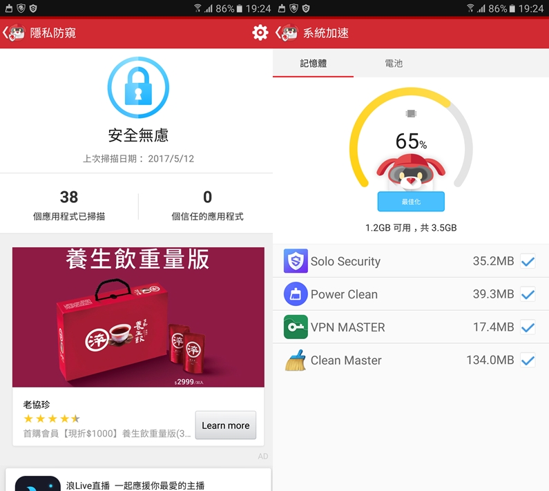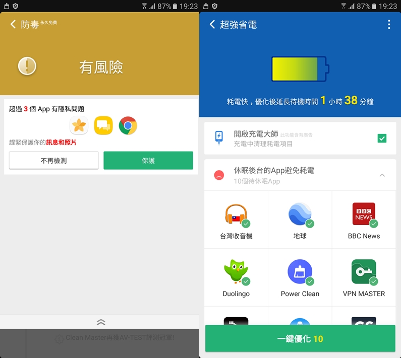防毒的部分要處理的主要是隱私問題,看你想不想加強保護,省電加強就是測出一些耗電的程式,可以選擇關閉不要讓它們常駐後台。