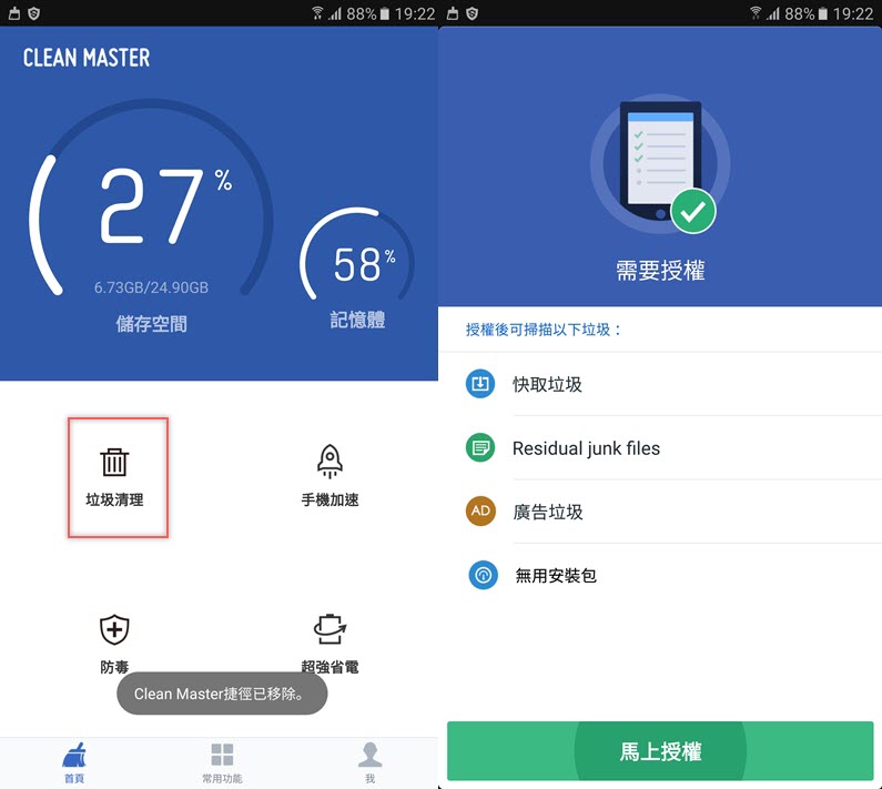 打開也是會自動體檢,具備垃圾清理、手機加速、防毒、省電四大基本功能,需要經過授權才會幫你掃描垃圾,點「馬上授權」。