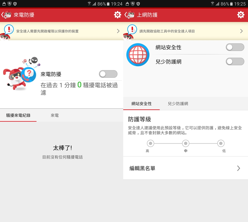 這裡就是結合 Whoscall 防騷擾的地方,阿湯原本只裝 Whoscall 並沒有擋到所有封鎖的電話,再加裝這款希望真的可以加強防守,另外也可以針對網路安全處理,但都要先開啟系統權限才能設定。