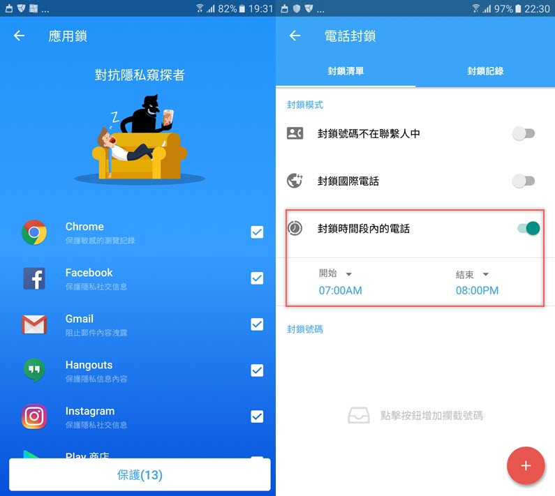可以針對其他 APP 設定應用鎖來保護,還有電話封鎖的功能,拒絕非通訊錄或自設黑名單內的號碼,或是某個時間段不想接電話也能在這裡設定。