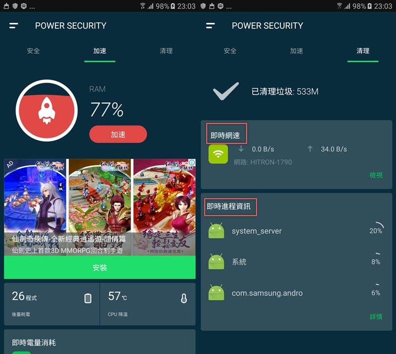 加速和清理垃圾的功能也不錯用,清理垃圾後下面還會顯示即時網速與即時進程資訊,不過這類 APP 都有一個共同的缺點就是廣告很多,而且都佔不少版面。