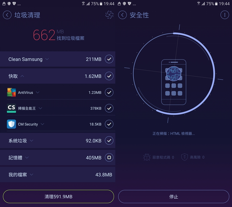 垃圾清理的速度也很快,並列出是哪些地方留下的垃圾,安全性的部分會將整個手機的內容都進行檢查,其他還有像是錄製螢幕和詐騙封鎖的功能,但都要另外下載其他 APP 才能用。