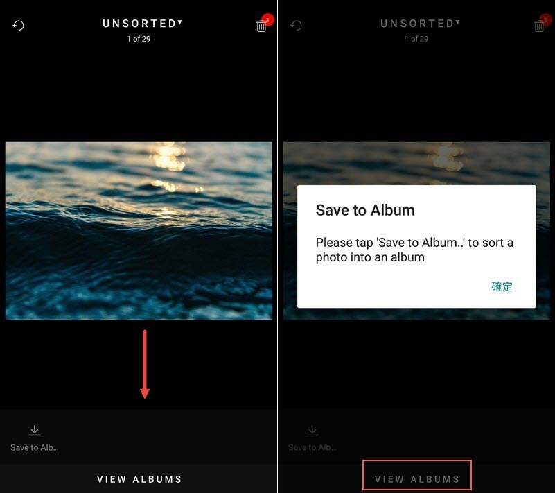 APP 會自動跑下一張圖,將它往下滑會出現請你點存到相簿的圖示,如果沒建立相簿,先點「VIEW ALBUMS」。